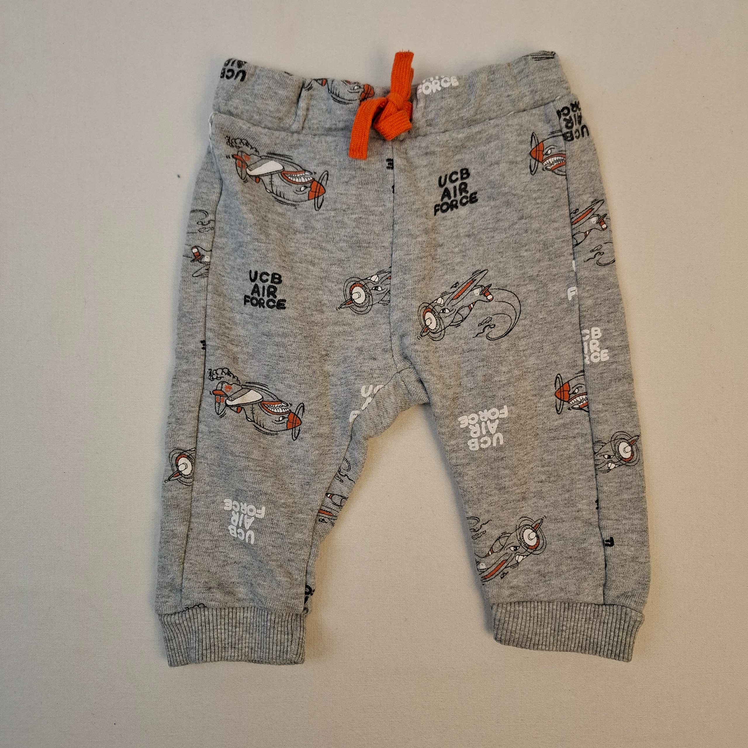 - Pantalon de jogging gris, parsemé d’avions et d’inscriptions « UCB Air Force », taille élastiquée avec des cordons orange à nouer.