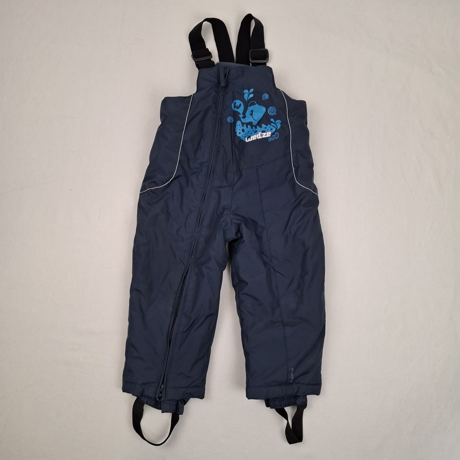 Autres commentaires : Salopette de ski bleu nuit, doublée en polaire grise, garniture en 100% polyester dont 90% recyclé, bretelles élastiquées réglables, fermeture par zip latéral sur le devant, illustration poisson en bleu petrole, semi élastiqué au dos, système de guêtres en bas de jambe.
