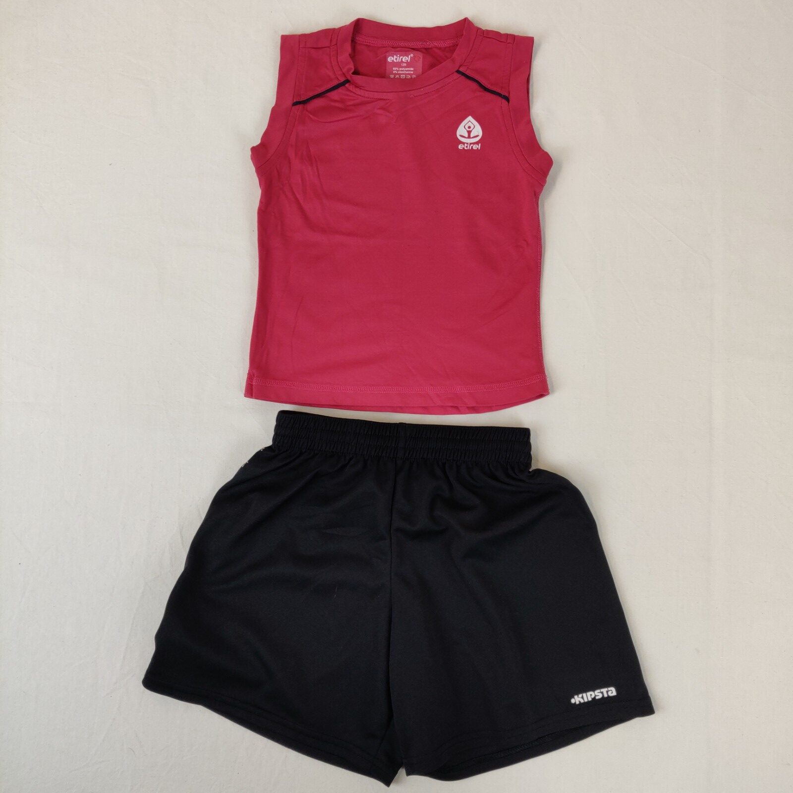 Autres commentaires : Short de sport Decathlon Kipsta noir avec taille ajustable. T-shirt rose Etirel offert avec petit défaut col et face avant [92% polyamide et 8% elasthanne t-shirt]