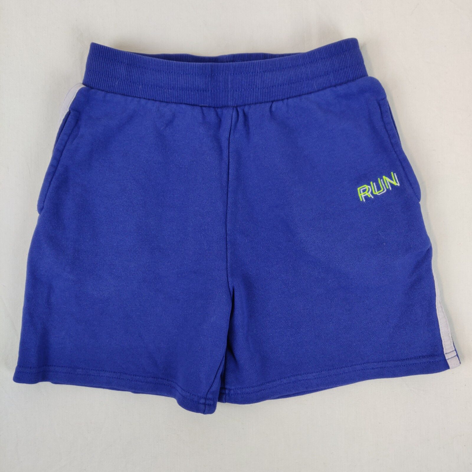 Autres commentaires : Short de sport – bleu avec une bande blanche latérale. Inscription cousue centrale « Run ». Taille élastique avec cordon interne blanc. 2 poches latérales.