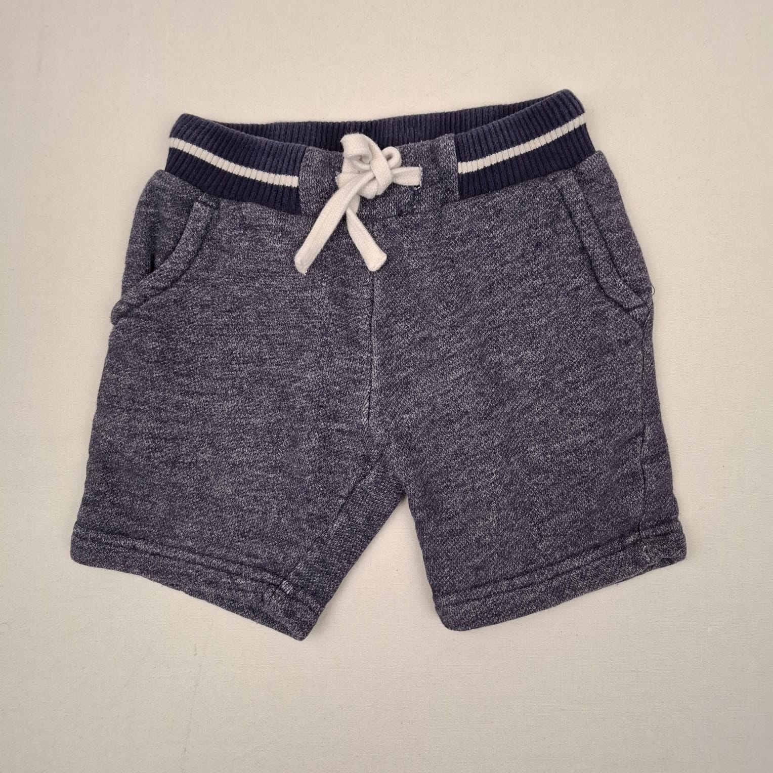 Autres commentaires : 12% acrylique – Short sportswear bleu chiné et taille élastiquée côtelée bleue avec ligne blanche, cordon blanc.