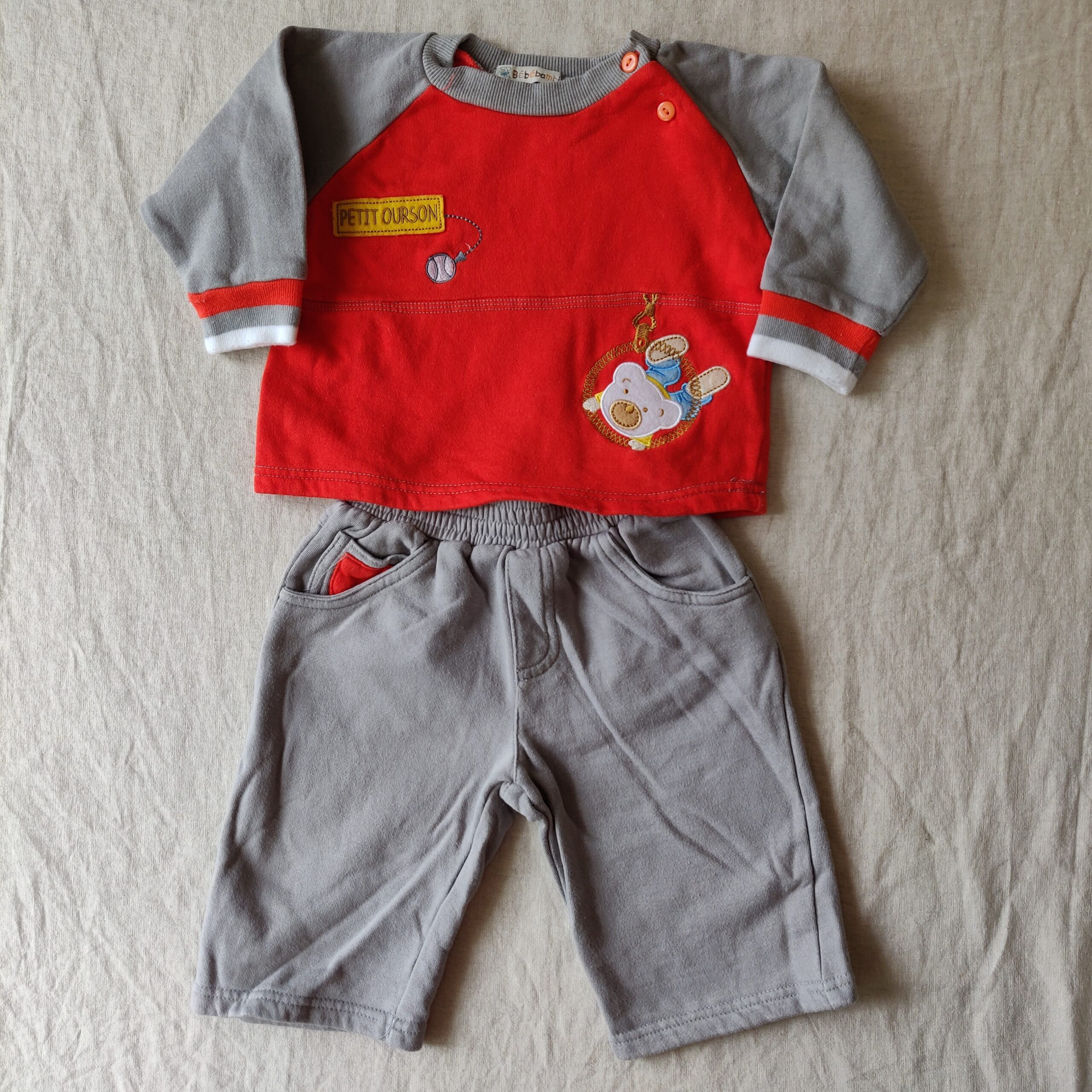 Autres commentaires : Sweat orange et gris, motif petit ours sur une tirolienne inscrption « petit ourson », fermeture par 2 boutons à l’épaule gauche, et pantalon assorti gris, deux poches latérales, taille élastiquée.