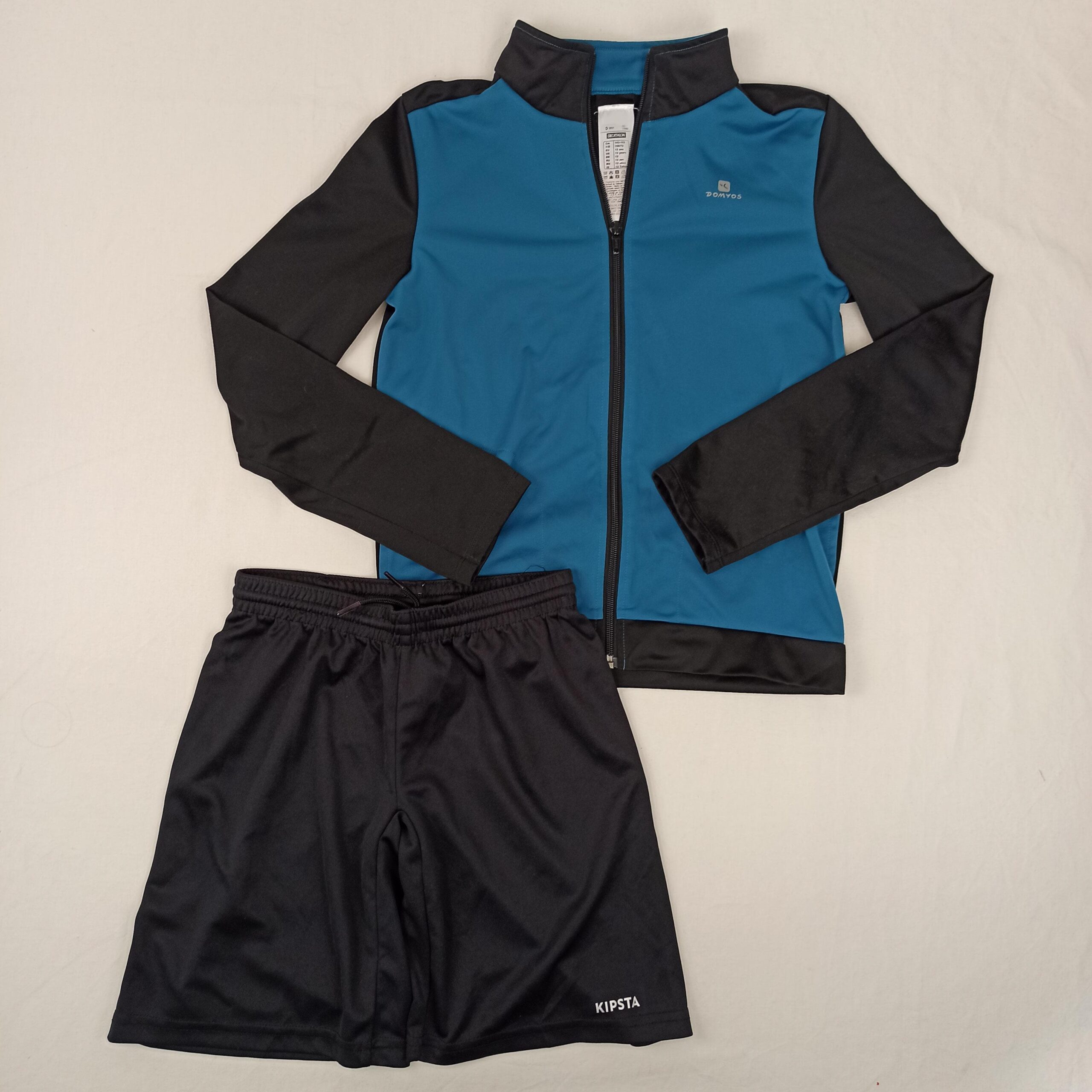 Autres commentaires : Sportswear 2 piéces: – Pull du sport en noir et mer bleu, devant fermeture par zip, doublure polyester100%; – Short du sport en noir, taille élastique réglable.